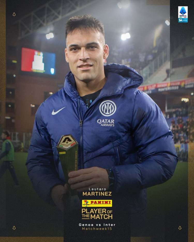 传射建功,官方:劳塔罗当选热那亚1-2国米全场最佳球员