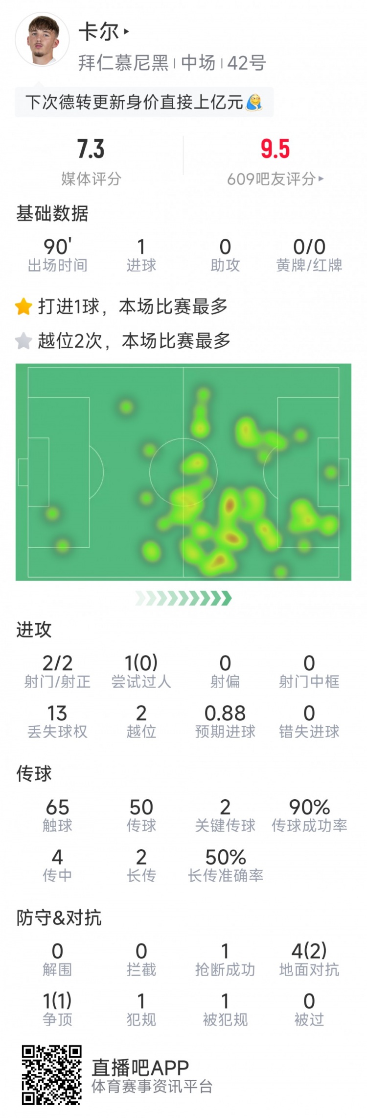 卡尔本场数据:1粒进球,2次射门均射正,2次关键传球
