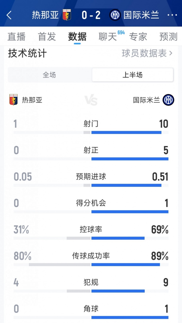 国米2-0热那亚半场数据:射门10-1,射正5-0,国米控球率近7成