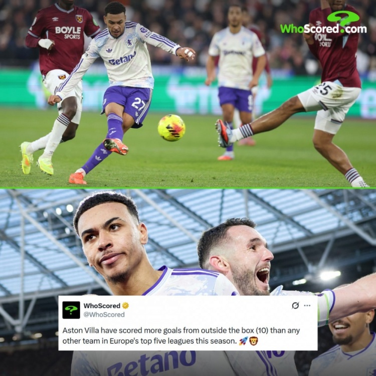 据WhoScored数据统计,本赛季,阿斯顿维拉在禁区外打入10球,比欧洲五大联赛中的任何其他球队都多。